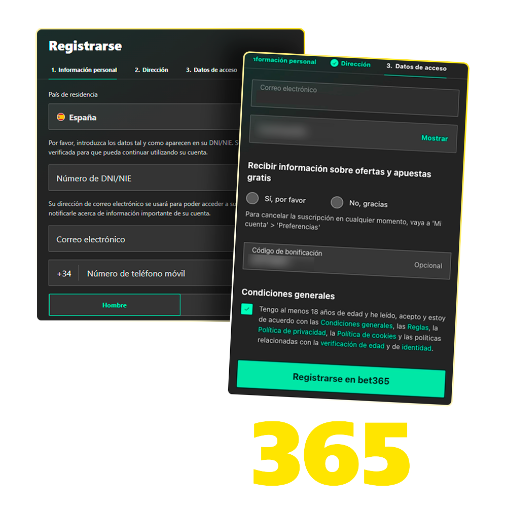 Resulta indispensable introducir el número de DNI/NIE y la fecha de nacimiento en Bet365. Este es el paso más importante porque marca la ruta inicial de todo el proceso de creación y posterior verificación de la cuenta. Cuando escribes tu nombre y apellidos, debe ser exactamente igual a como aparece en tu DNI o NIE, letra por letra y sin abreviaturas. Es obligatorio indicar correctamente tu número de documento y tu fecha de nacimiento, confirmando que eres mayor de 18 años.
